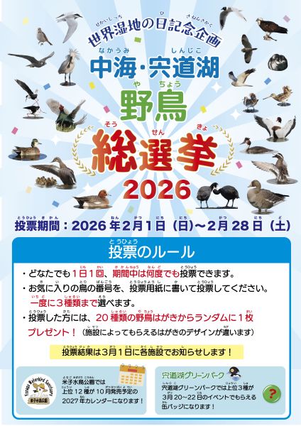 世界湿地の日を記念して、中海・宍道湖でみられる野鳥20種類の中から、来館者に人気投票をしていただきます。投票者には候補種の写真はがき(施設で異なる)をランダムでプレゼントします。投票の結果、上位12位に選ばれた野鳥の写真でカレンダーを制作し、10月ごろに販売予定です。開票結果は3月1日(日)にホームページとネイチャーセンターで発表します。