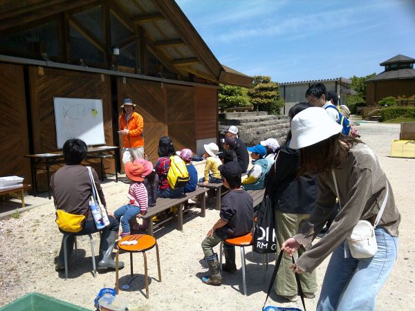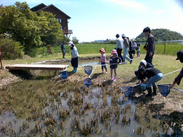春のメダカ池にいる生き物をつかまえて観察します。採集した生き物を持ち帰ることはできません。