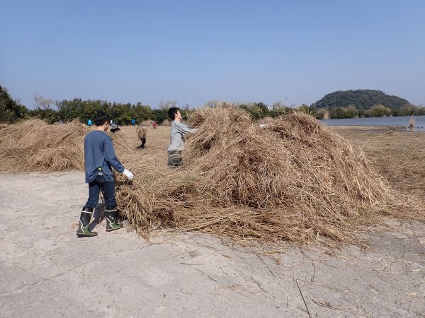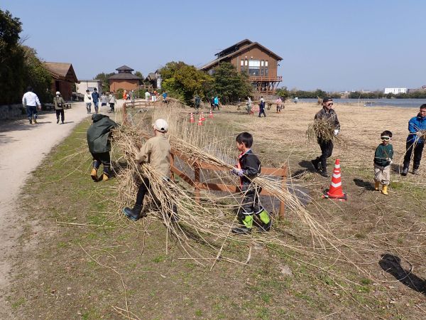 背が高く活力のあるヨシ原を育成するため、あらかじめ刈り倒しておいた園内の枯れヨシを回収して片付けます。